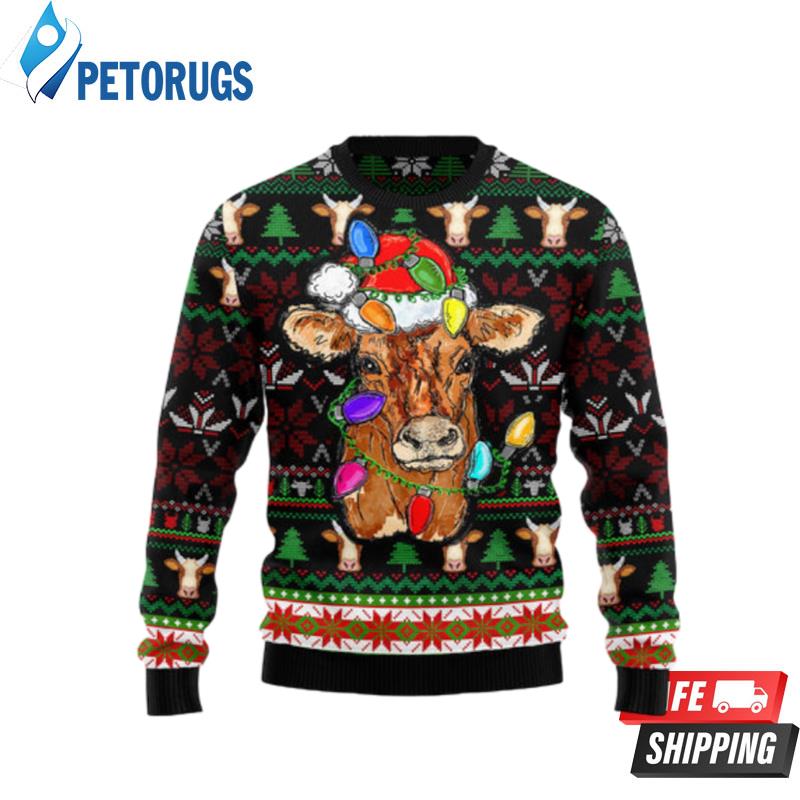 Cow With Santa Hat And Christmas Lights Ugly Christmas Sweaters
