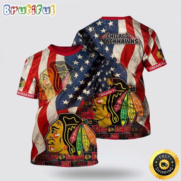NHL Chicago Blackhawks All Over Print T Shirt With American Flag Pattern Summer T Shirt